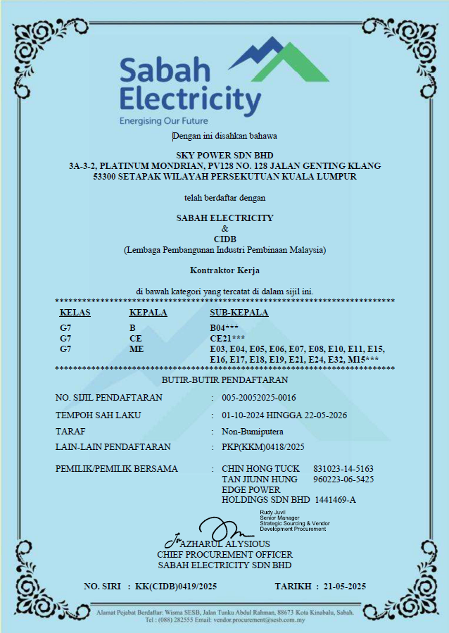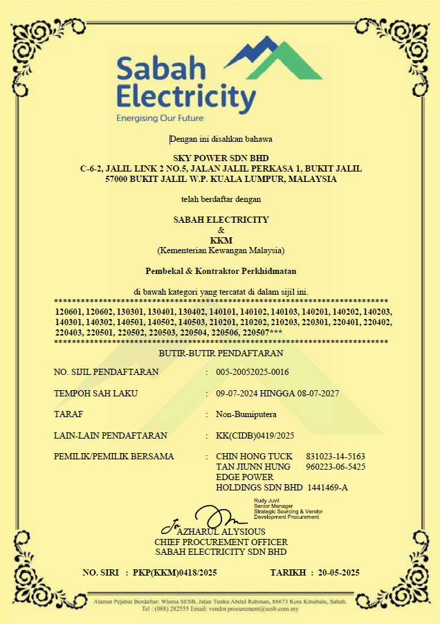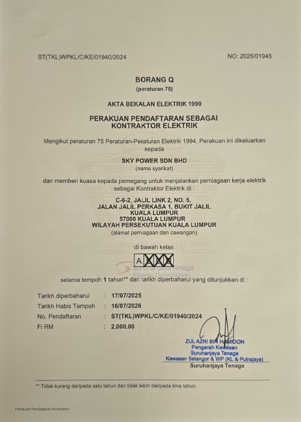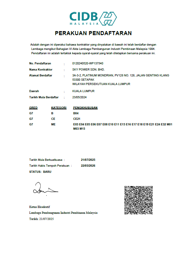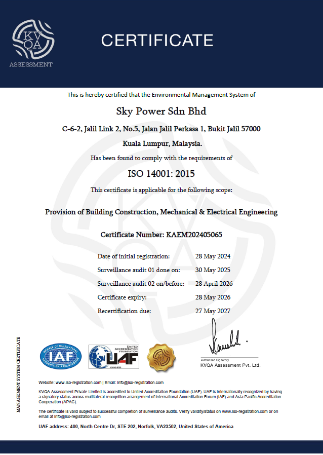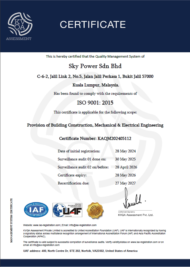 Sky Power Sdn Bhd, located in Bukit Jalil, Kuala Lumpur, is a distinguished Mechanical and Electrical (M&E) engineering company powered by a vibrant and dedicated young team. Our core commitment revolves around surpassing client expectations, achieved through the consistent delivery of projects within stipulated timelines and budgets. At the heart of our operations lies the unwavering dedication to prioritize our clients’ needs, ensuring their satisfaction at every step of the project journey.